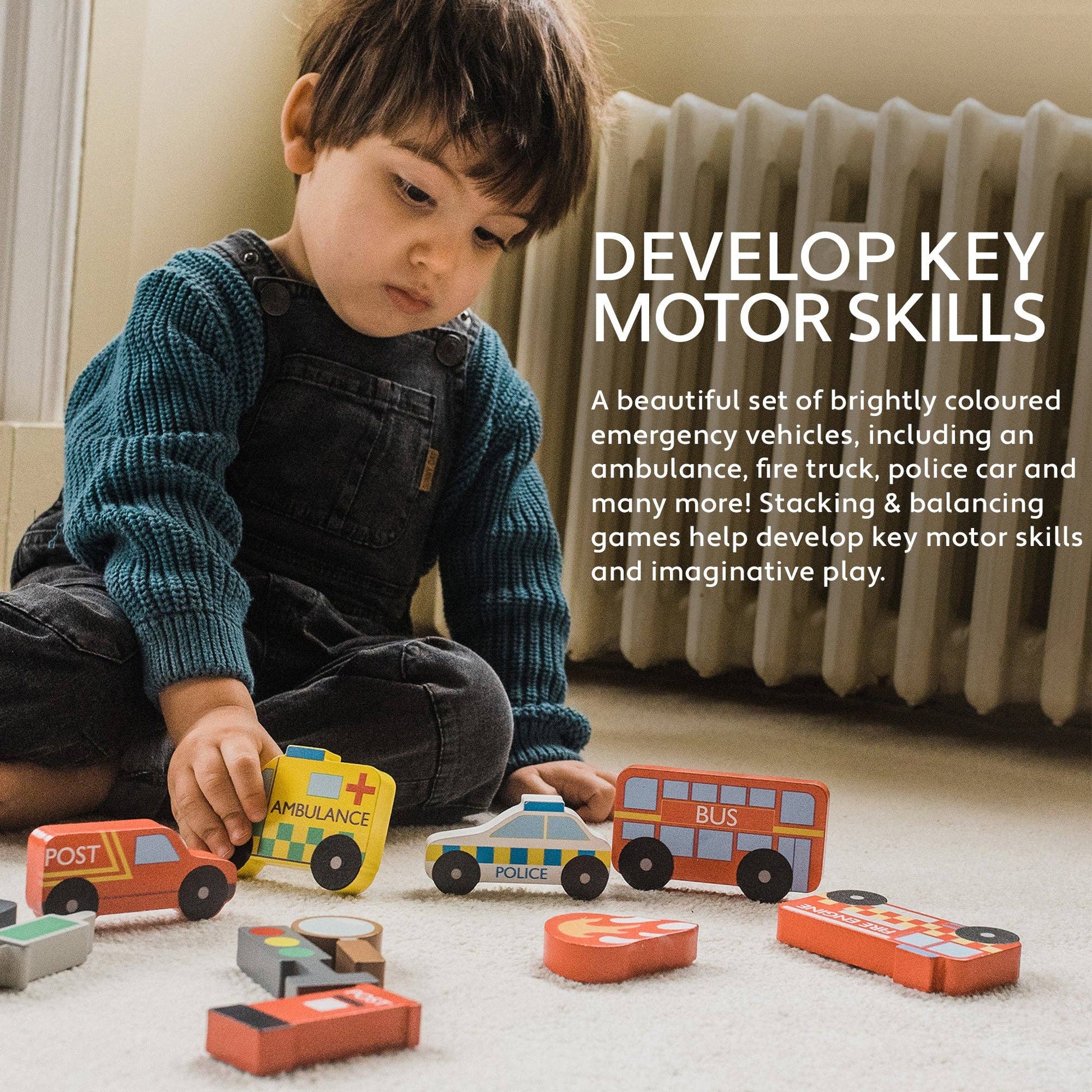 This is a great collection of coloured emergency service vehicles and items, which are great for stacking up or imaginative play! The set is perfect for stacking up and knocking back down, as well as for encouraging imaginative play. This lovely set comes with a handy drawstring bag for conveniently storing them away.